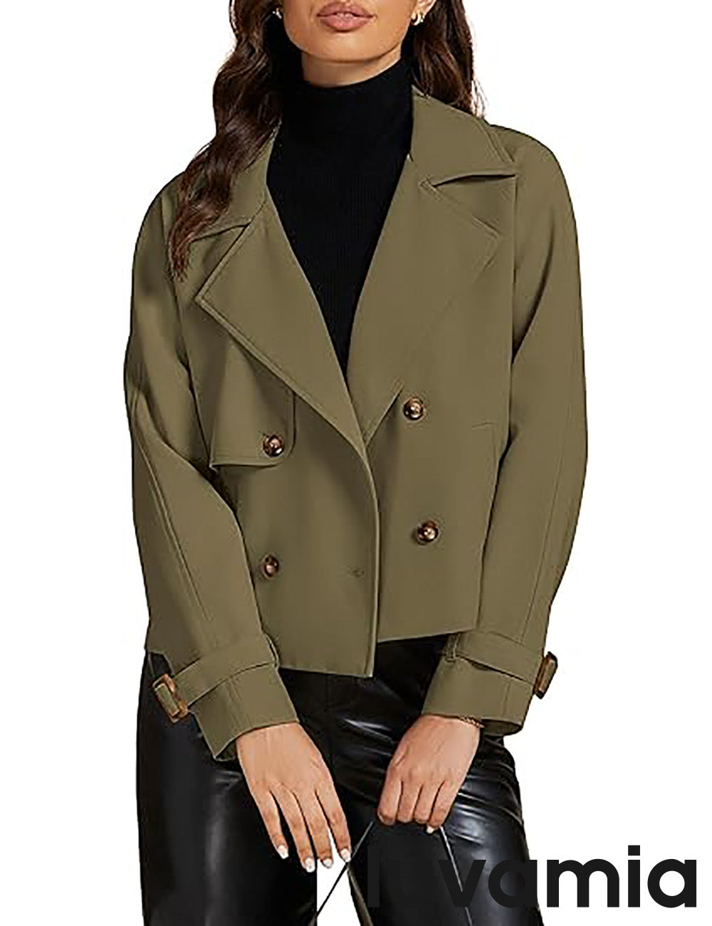luvamia Cropped Trench Coat for Women Long Sleeve Double Breasted Notched Lapel Casual Loose Fit Jackets with Pockets