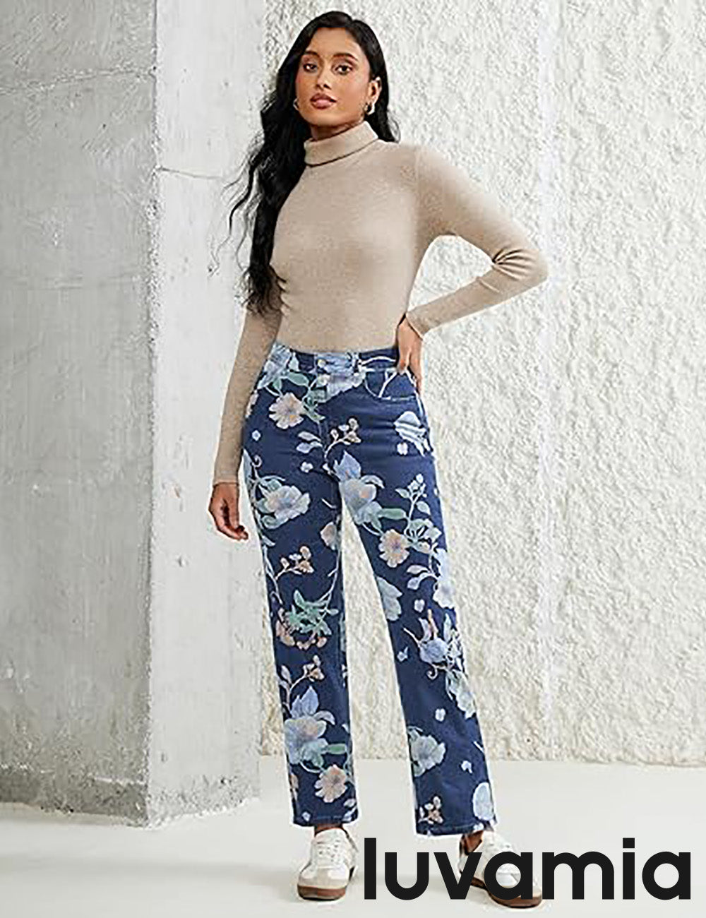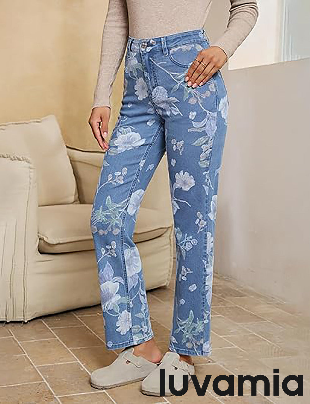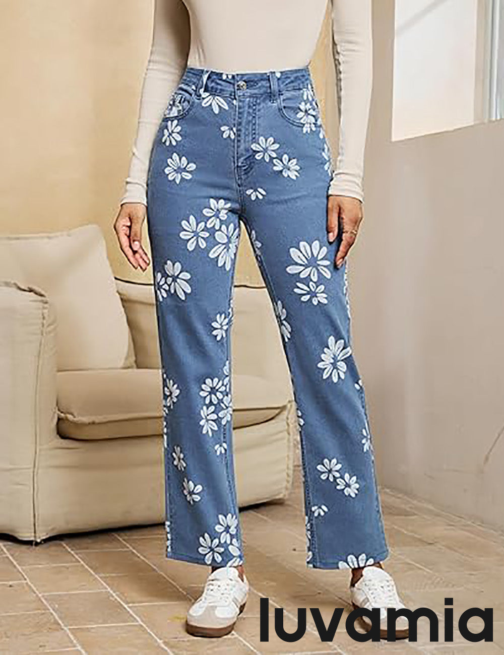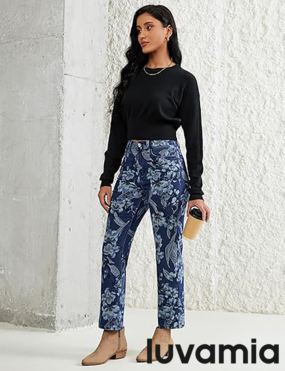 luvamia Straight Leg Jeans for Women Floral Printed High Waisted Trendy Cute Vintage Stretchy Denim Pants Boho Jeans