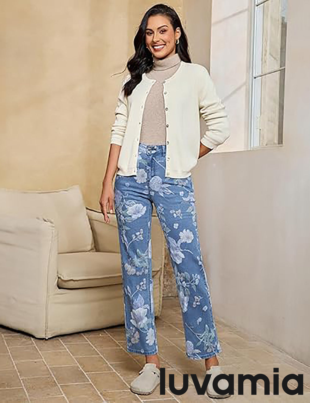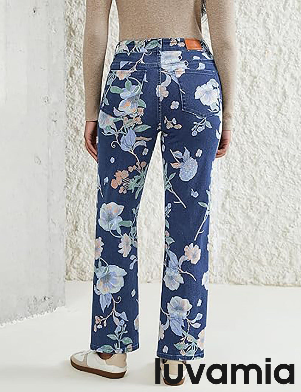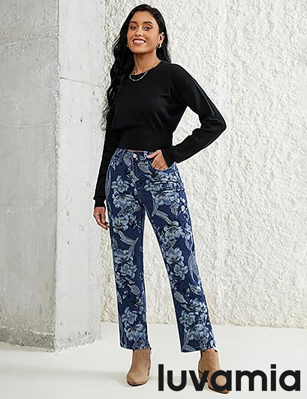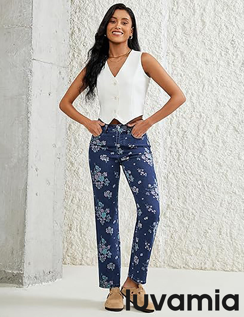 luvamia Straight Leg Jeans for Women Floral Printed High Waisted Trendy Cute Vintage Stretchy Denim Pants Boho Jeans