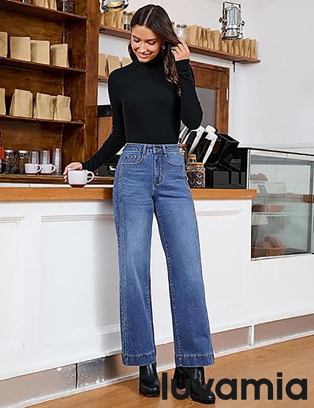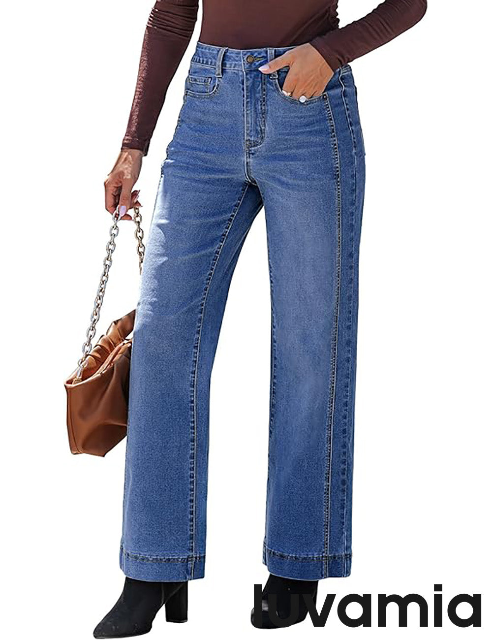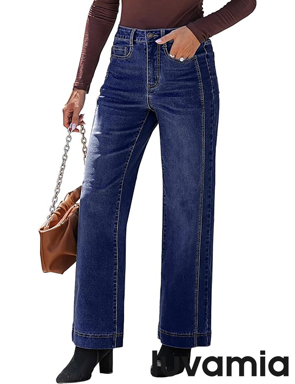 LUVAMIA Timeless High Waisted Flare Jeans Breathable Denim All Season Styling Functional Pockets