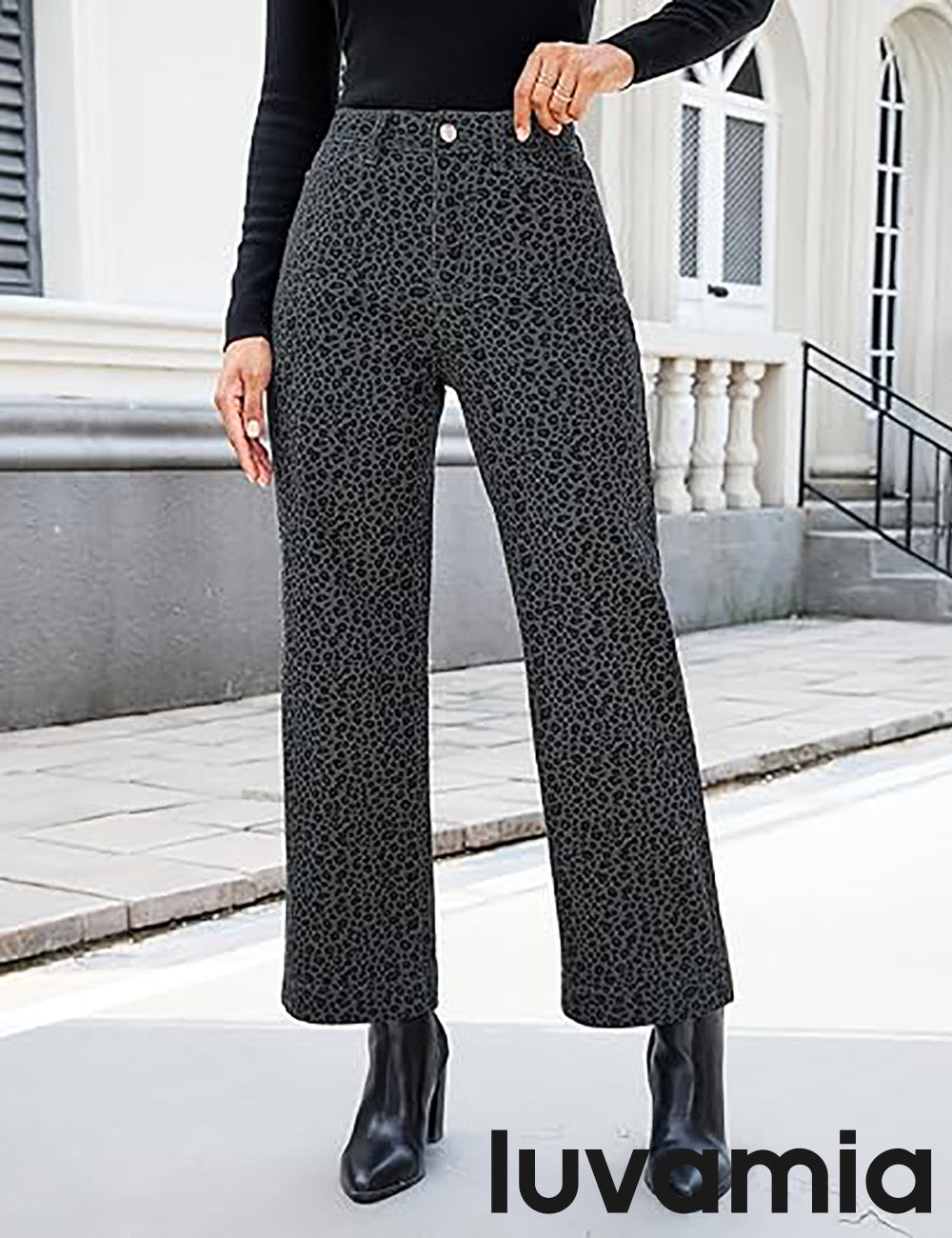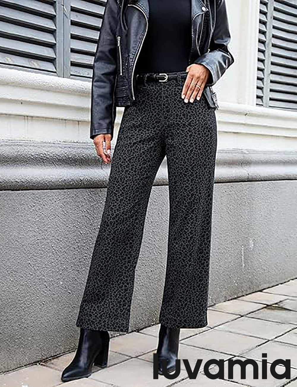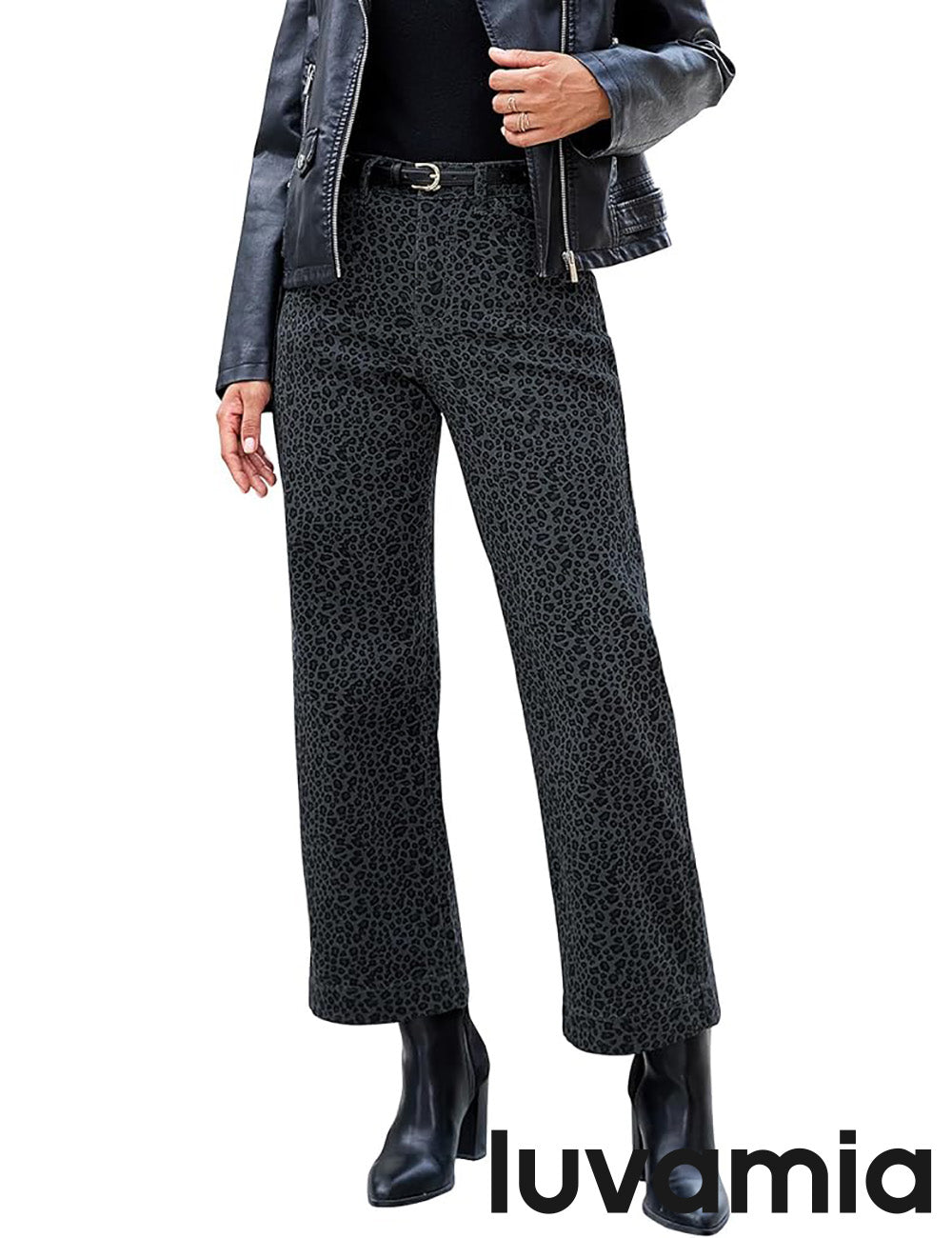 - These leopard jeans, designed with a high waist and wide leg silhouette, bring both retro charm and modern comfort. Featuring 4 functional pockets and a classic zipper button closure, womens leopard pants blend everyday practicality with timeless style