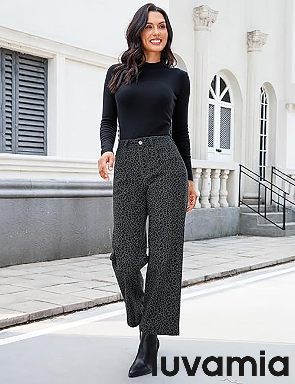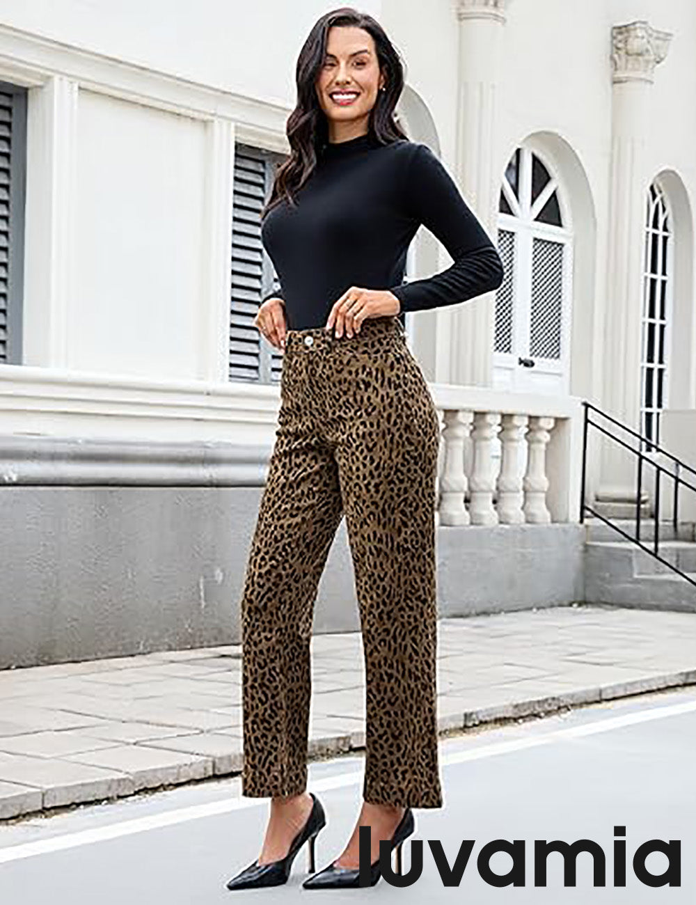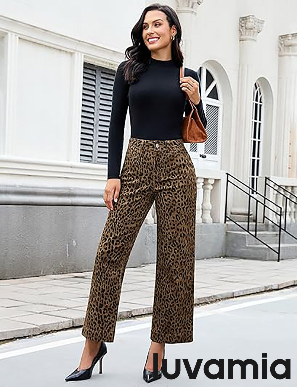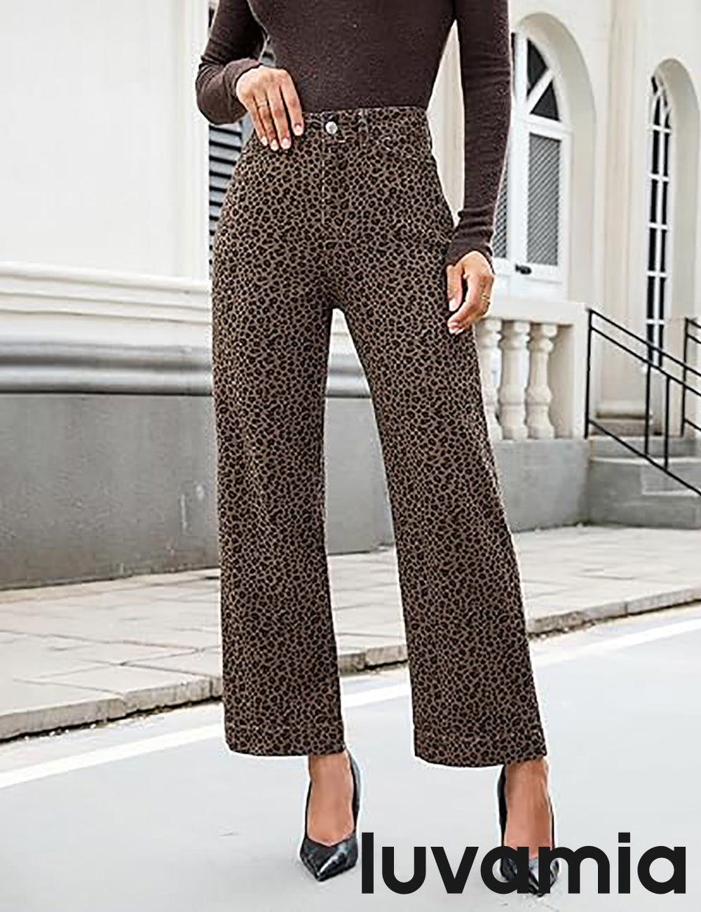 - These leopard jeans, designed with a high waist and wide leg silhouette, bring both retro charm and modern comfort. Featuring 4 functional pockets and a classic zipper button closure, womens leopard pants blend everyday practicality with timeless style